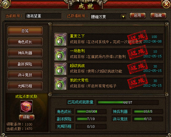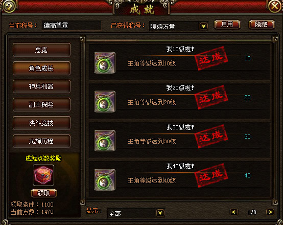 点击游戏主界面的最右上角功能图标“成就”,可进入到成就系统界面查看所有的成就任务信息。成就系统界面里包含了当前已获得的成就信息,以及即将获得的成就。