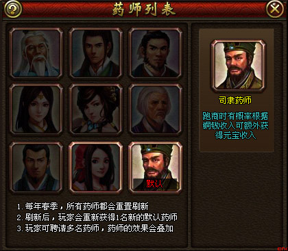 药草的收益除了与种子品质高低有关之外,还与药园聘请的药师有很大的联系。药师按效果可划分为九类,即小概率产量翻倍、大概率产量翻倍、小概率种值冷却时间减半、大概率种值冷却时间减半、小概率增加额外铜钱收入、大概率增加额外铜钱收入、小概率获得稀有品种、大概率获得稀有品种、额外获得元宝。