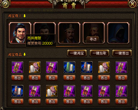 系统中设计了5个商人,最左边的“市井商贩”为默认显示的商人。玩家每次对商人进行淘宝操作,都可能自动发现后续高级商人,不同的商人决定了不同的产出物。