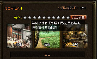 《传奇三国》寻访系统中还有民心的设定,民心越高,特殊组合事件的奖励就越高。民心有两种方式获得,一种是直接花元宝满10星,另一种方式则是需要靠在寻访的过程来随机触发。