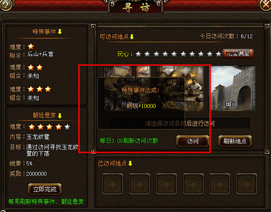 特殊组合事件和朝廷悬赏为每周刷新一次,寻访次数则为每天刷新一次,每天共12次寻访机会。