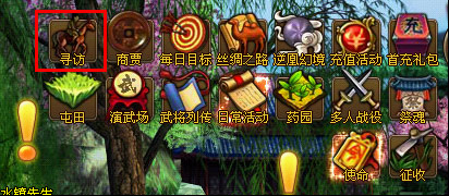 寻访系统是游戏中的一个特色系统,玩家可以通过使用该系统来获得大量的铜钱、军功和威望,通过点击游戏主界面右上角的“寻访”功能图标进入。