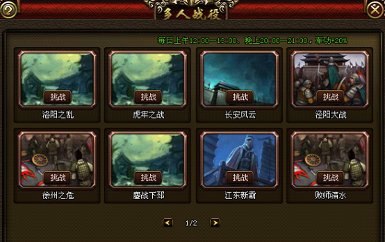 每场战役开启的条件与玩家官职相关联,官职等级越高,可开启的战役地图也越高,同时,获得的奖励也越丰富。