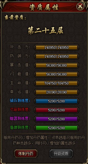 资质觉醒达到第2层后,可以通过服用属性丹药从而增加人物的[攻击、防御、生命、暴击、闪避、幸运]属性,甚至是[骑兵、弓箭、暗器、盾牌]的熟练度。