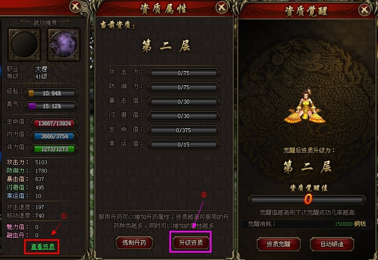 达到28级玩家,点开【人物】面板右下角选择【查看资质】,即可通过【升级资质】从而进行【资质觉醒】。