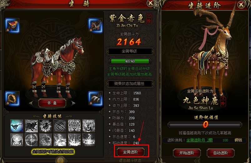 坐骑除了角色的升级而升级外,想要提升各个属性,获得更多的加成,还可以通过消耗道具来进阶。