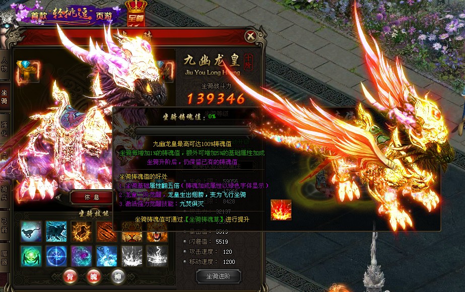 使用道具【坐骑铸魂石】可可额外增加坐骑当前属性的5%,坐骑铸魂满值后,可以获得龙皇二阶觉醒,激活强力觉醒技能【九焚俱灭】。