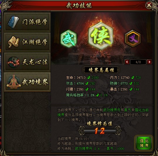 境界的提升需要消耗真气或者【武功境界丹】,当修为越高,提升境界层数的难度也就越大;当境界层数达到上限,则需要【境界突破丹】来突破进入到下一个境界。