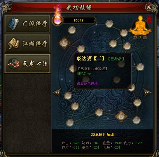 天龙心法是赤天技能系统的特色系统之一,玩家等级达到43级后可开启该系统,激活心法星图不仅可以提升技能等级,还可以获得额外属性加成。但是各个星位的激活都存在一定的几率,而且每次都需要消耗一定的真气和铜钱,打通穴脉后,可以直接获得该星位的属性加成。