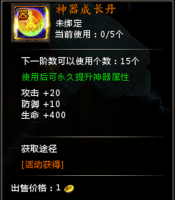(3)神器成长丹可以通过神器进阶副本掉落或者声望商店兑换获得;