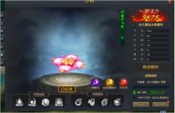 5.奇珍:“潜能丹”、“高级潜能丹”、“幻化丹”。可增加永久的灵骑属性从而提升灵骑的战斗力。