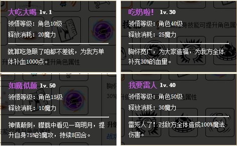 大吃大喝:单体加血技能,前期打怪还是很有用,可以升级,但不一定要点满。
