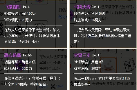 静心防魔:满级己方群体增加50%魔防,并持续8回合,此技能对过副本和与阉派PK有一定作用,可根据自身需要升级。