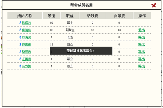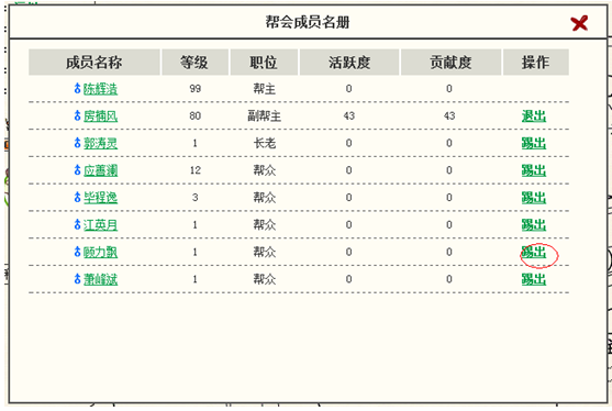 3、 出现成员列表,其中只有帮主才能踢除其他玩家。