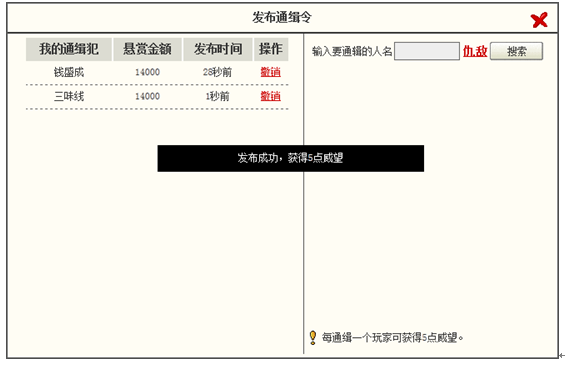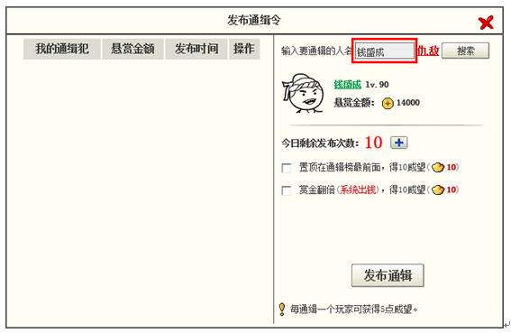 3、 出现发布通缉令面板,输入要通缉的玩家名。