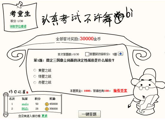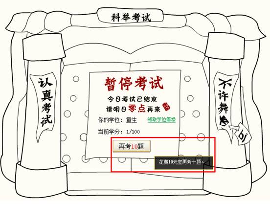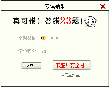 4、如果本次考试中有答错的题,答完最后一题后,弹出“考试结果”有一次改错的机会,需要花少量元宝将答错的题目改对,并且拿全对奖励。
