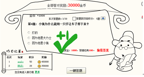 3、每答对一题,将有相应的金币奖励,答错也有少量的金币。