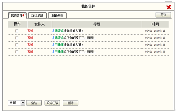 玩家之间的非即时交流工具。分为我的信件,互动消息,我的战报三个类别。玩家之间的PK战报可以反复观看。玩家可以对信件进行保存,删除等操作,如果玩家长期未整理信件,系统会为玩家自动清理2天前的信件。