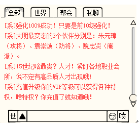 玩家之间的即时聊天工具,分为全部,世界,帮会,私聊,系统4个频道。