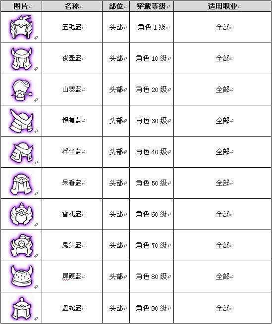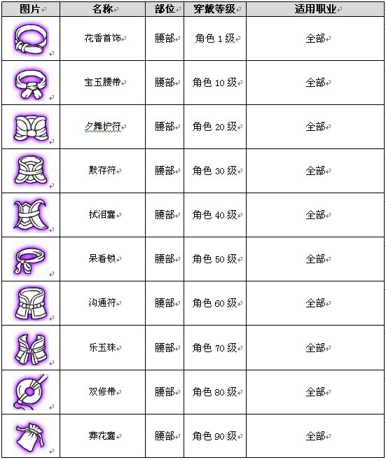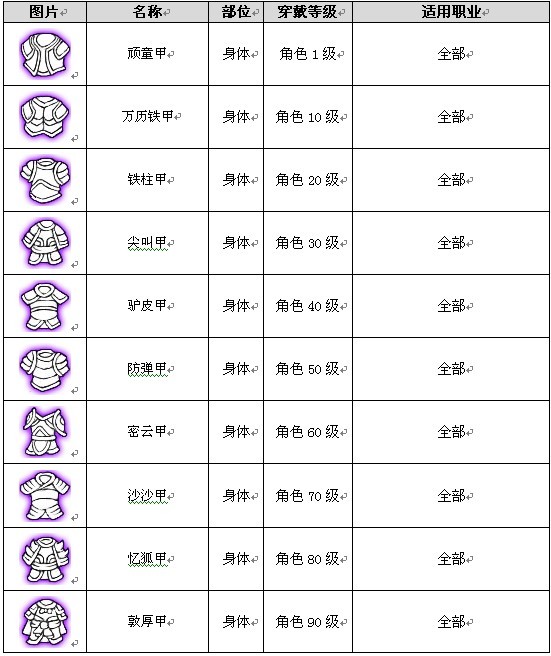 装备分为1级、10级、20级、30级、40级、50级、60级、70级、80级、90级十个穿戴等级。