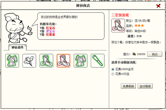神秘商店是游戏中一个中期的一个功能,在游戏中,如果想招募伙伴或者想合成各式各样的极品装备,其中就会缺特产,缺宝石,但此时有了这个神秘店功能就完全不用担心了,只要在神秘商店中花费战功或者金币刷新,就会出现各种各样的宝石与特产,立即补充你可能目前极需要的物品,解决你的燃眉之急。