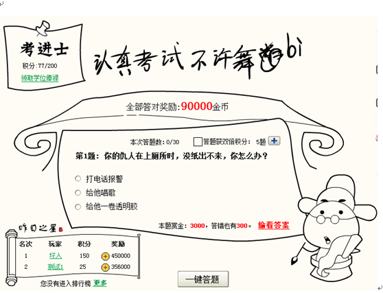 喜欢答题的朋友不要错过哦,在这里你可以见识到各种搞怪的、搞笑的、邪恶的、宇宙超低无敌变态的各种题目,让您可以在闲暇之余找点乐子,同时也考验着您的幽默感和考试能力。