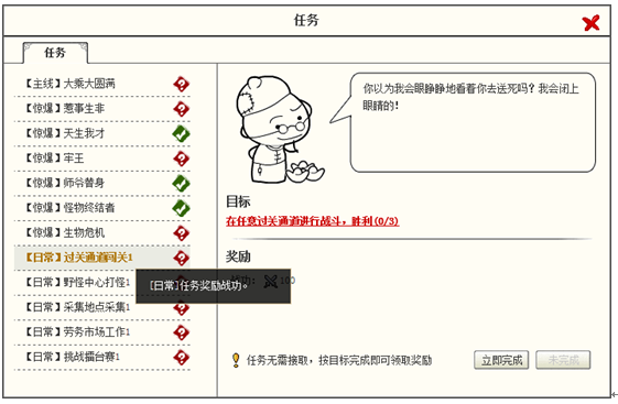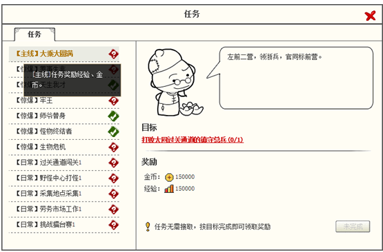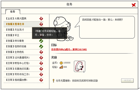 主线任务,需要完成目标即可完成任务,该任务不可重复进行。完成后给予丰厚经验和金币奖励。