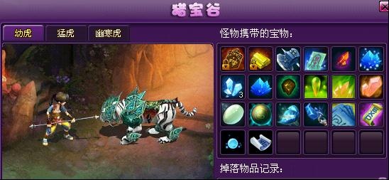 游戏内为了方便玩家获得高级装备以及各种高级道具和高级宝石置了猎宝谷通过猎宝谷玩家可以得到迅速提升自身的实力的物品。猎宝谷内打的老虎不同获得的高级道具也不同。境界越高的玩家猎取的高级装备等级越高。