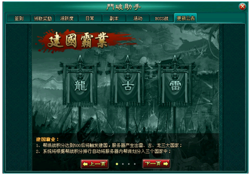 国家分配:帮派战积分前三的帮派依次分配为雷国、古国、龙国,其余帮派按照排序分别加入三个国家,无帮派玩家需自主选择国家加入;