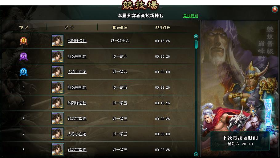 1、在战场、帮战、战力排名较高的用户将自动入围竞技场比赛,淘汰赛采用一对一淘汰赛,八强以上淘汰赛采用一人对抗多人的方式;胜利者除了可以获得奖励,还可获得进入下一轮比赛的资格。