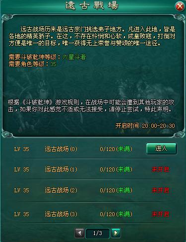 新服开启前两天每晚20:00~20:30为远古战场,第三天开始与异火争夺战轮换。