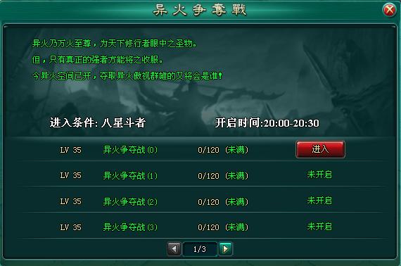 新服开启前两天每晚20:00~20:30为远古战场,第三天开始与异火争夺战轮换。