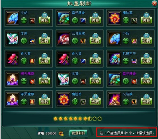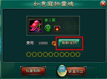 点击批量刷新,消耗一定量铜币可随机刷新出多个宠物(但只能选择其中一个破蛋而出)。