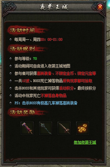 玩家等级达到70级,每周一,周四20:00-21:00可通过九洲城的夜袭王城NPC进入