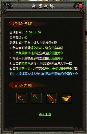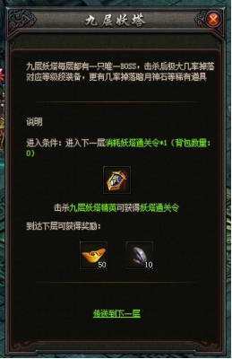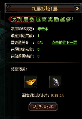 九层妖塔中,每进入下一层都可获得绑定元宝和黑铁矿的奖励