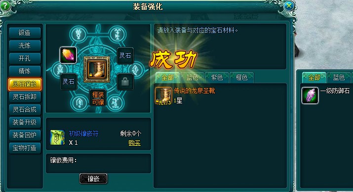 可对有孔的装备进行灵石镶嵌,镶嵌成功后装备可以获得灵石的属性加成,最多镶嵌多少个灵石由装备孔数决定。灵石镶嵌需要“镶嵌符”,每次镶嵌灵石会消耗一定数量的镶嵌符。