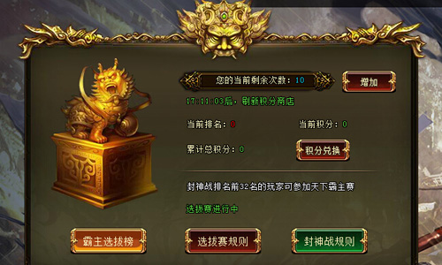 《帝王霸业》游戏中封神战的积分很重要,它关系着你在封神战中的排名,关系着排名奖励。封神战排名前32名的玩家可参加天下霸主选拔赛,有机会获得霸主称号哦!所以封神战中每一场比赛都很重要,一定要提升自己的实力,强化自己,争取每一场的胜利。
