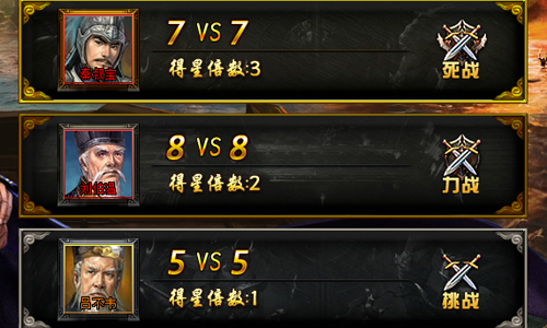 看了规则后,相信大家都知道怎么玩了吧,那小编就来说下技巧了。在选择战斗方式上,小编建议选择死战,为什么呢?因为过关斩将中的关卡都是很容易、很简单的,不过你的战斗力也需要提升下哦。当通关到一定关卡时,可选择战斗状态加成,在每一次选择加成上可以选加成比较高的。