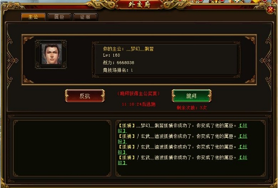“被征服”就是当了别人的属臣。当属臣其实没什么不好的,在这个笑贫不笑娼的时代,赚钱才是硬道理。看见下图的“跪拜”按钮了没?只要你点一下,可以随机得到数量不等的金、银箱子。别小看这些箱子,土豪也全靠这些箱子雄起的。对主公最多可以进行三次跪拜,而且每次“跪拜”之后的15分钟内不可以再次“跪拜”。当然,什么时候你的实力比主公强了,你就可以点击下图中“反抗”按钮,直接翻身做自己的主人,这个可是没有奖励的。