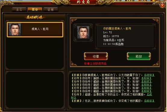 进入“属臣”玩法的界面后,全新的游戏体验就真正开始了。用一句话总结就是:征服与被征服。所谓“征服”,就是让您获得属臣的途径。点击玩家列表后面“征服”图标就开始征服了。“征服”有两种结果:胜利,失败。当征服胜利后,您所征服的对象就成了您的属臣。属臣列表中就会多一个人。属臣可不是光吃饭不干活儿的,在您获得属臣一段时间之后就可以进行“收缴”,每次“收缴”都会获得金币。每个属