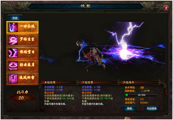 - 当玩家点技能按钮后,便可打开以下技能界面,玩家可在此界面中查看自己职业技能,技能点击升级,以及技能释放效果预览