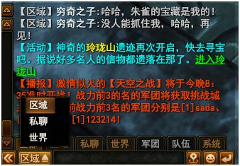 - 以下为聊天框的界面样式,玩家可以在此界面中切换世界,私聊,军团、区域、队伍等频道的内容,也可以进行拖拽滚动条进行信息的查看。