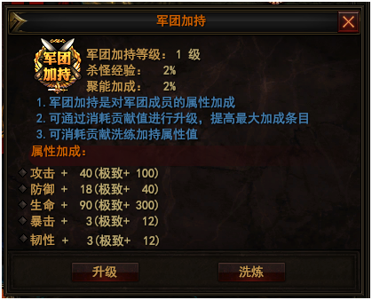 - 军团成员可点击军团加持徽章按钮,进行洗练、升级军团加持属性,如图1-3