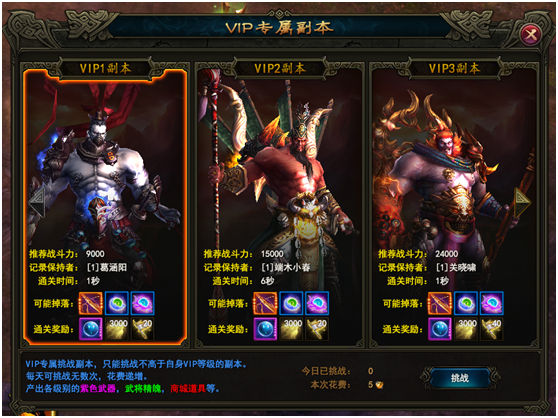 - 玩家可根据自己VIP等级,进行选择挑战。