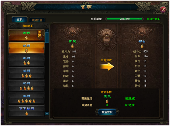 - 当玩家点击官职按钮后会弹出以下官职界面(默认选择官职标签页),玩家可在此进面中查看当前官职、威望、所有官职类别,官职激活条件。如图1-1