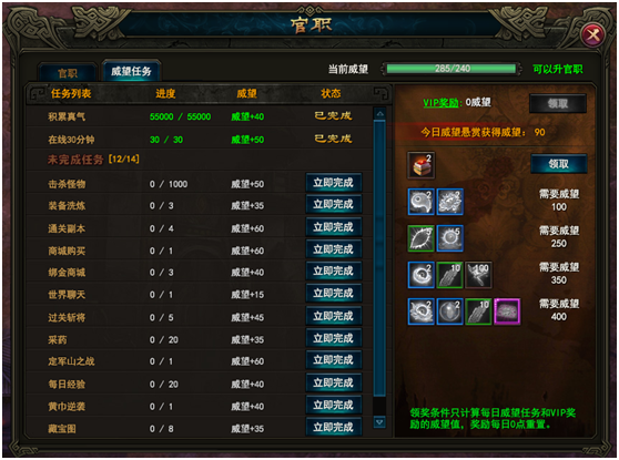 - 在威望任务界面,点击立即完成按钮,当激活黄金VIP1时,可消耗元宝立即完成指定的威望任务。