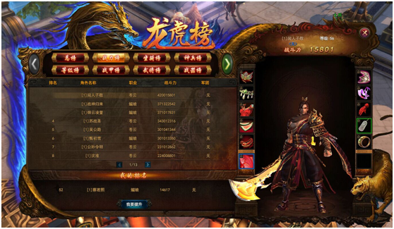 知己知彼,百战百胜。可通过龙虎榜查看其他玩家的装备、坐骑、神兵、战斗力、武将等,定为自身实力。