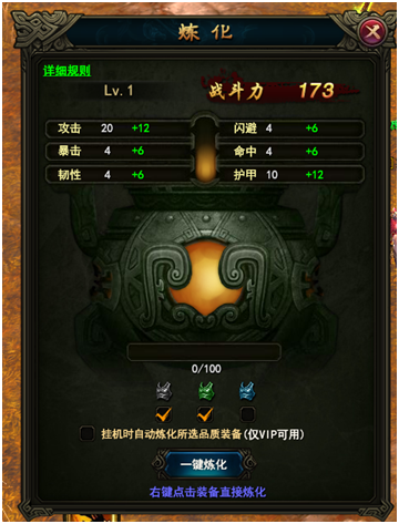 VIP玩家选择自动炼化后,自动战斗拾取的装备后,可自动进行炼化