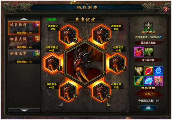 - 下图为过关斩将挑战副本,挑战副本可获得军功值。