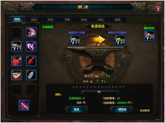 - 点击锻造页签后将显示出以下锻造界面,当前界面中可以选要强化的装备,查看装备强化等级。强化消耗道具。